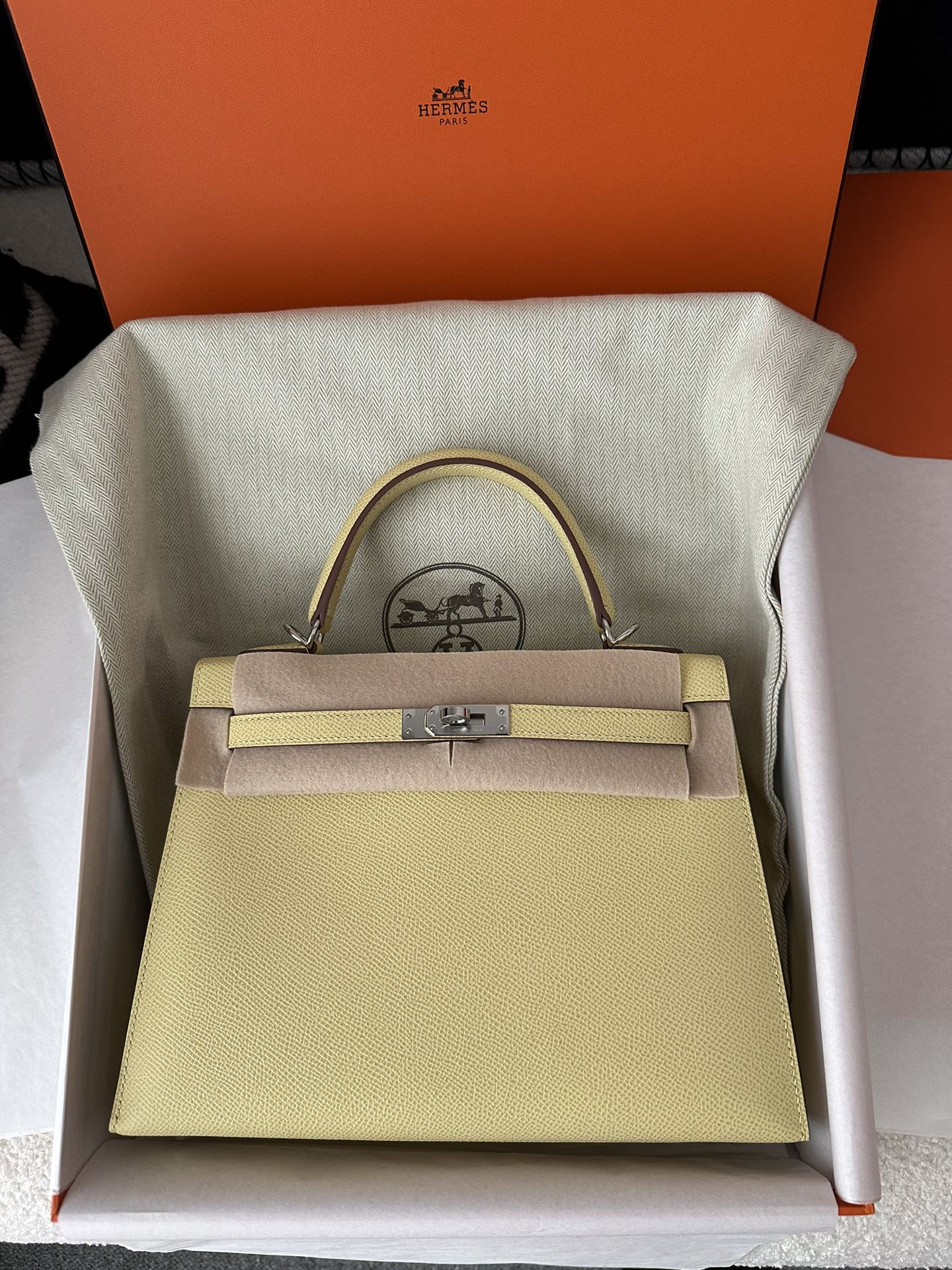 Kelly 25cm in Imported Epsom Leather, 1Z Jaune Poussin Chick Yellow with Silver Hardware